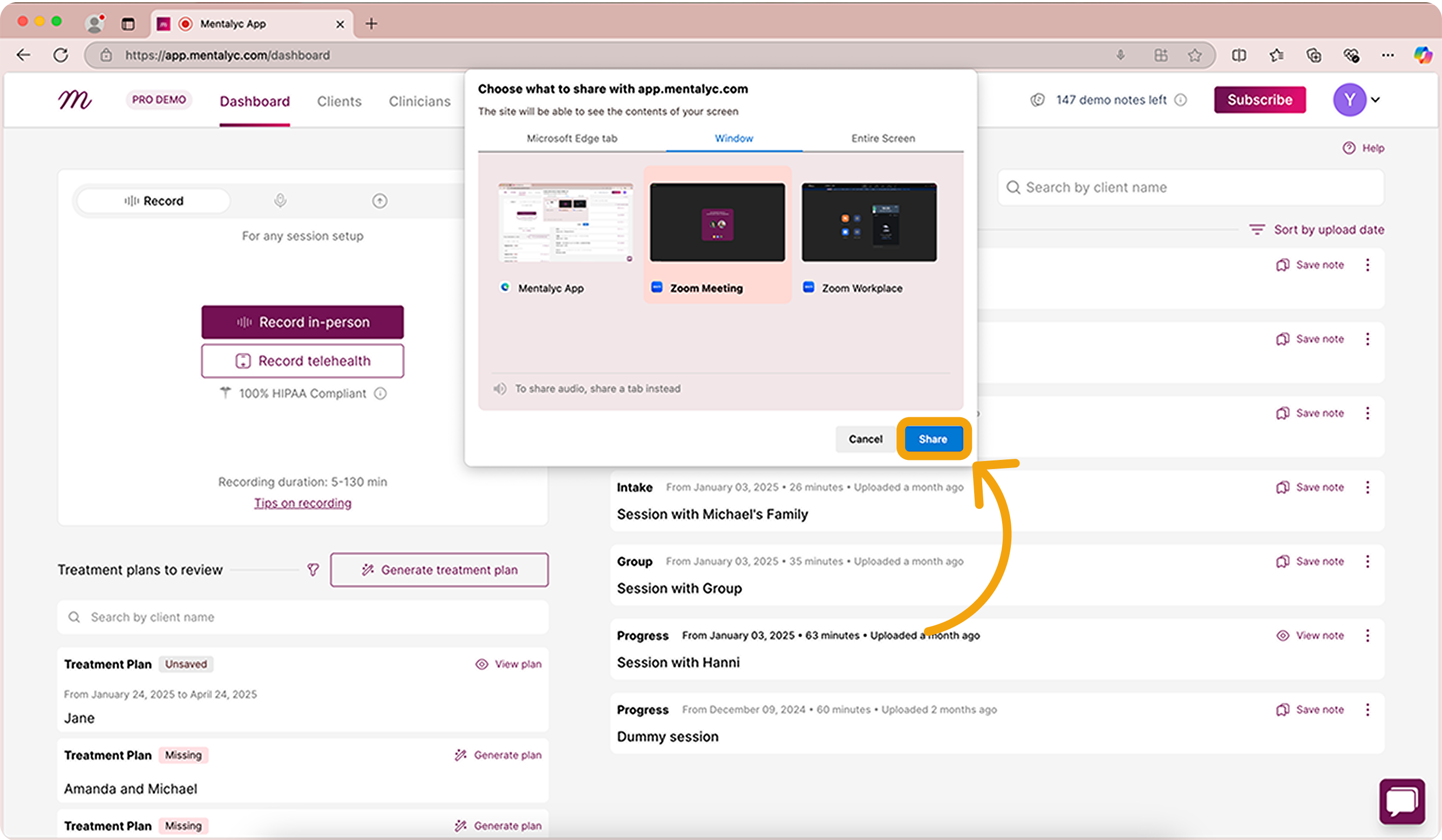 - For MacBook Users: Ensure the Mentalyc tab and your telehealth session tab are in the same browser window. Due to privacy restrictions on Apple Mac devices, the browser will not be able to capture audio from other windows or the entire screen.